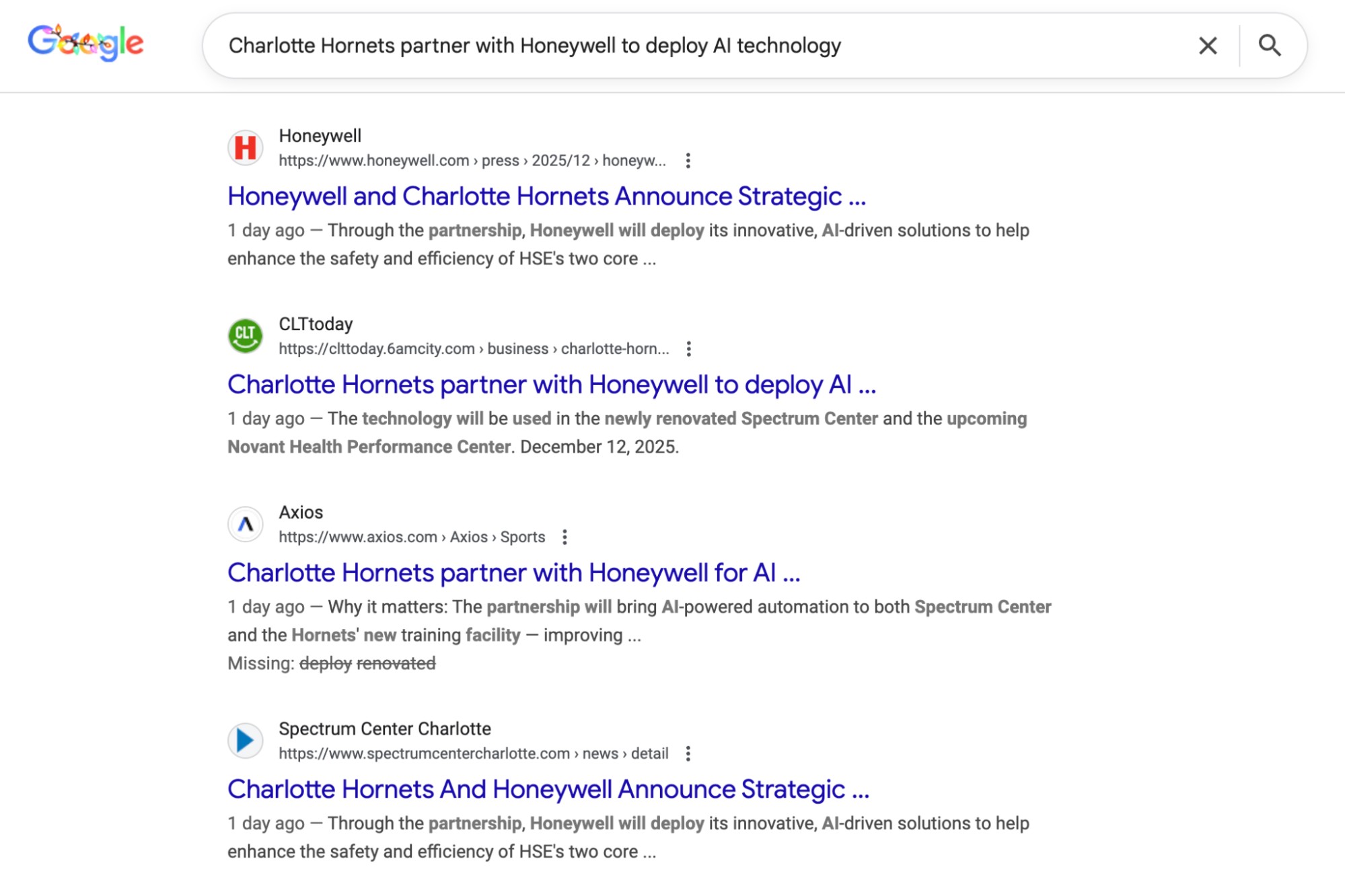 CLTtoday is a daily newsletter from 6AM City, which operates more than three hundred and fifty AI-generated newsletters across the country.29[29] A. Deck, “6AM City acquires Good Daily’s network of more than 350 AI-generated local newsletters,” NiemanLab, July 24, 2025. Accessed at niemanlab.org/2025/07/good-dailys-network-of-more-than-350-ai-generated-local-newsletters-finds-a-buyer/ CLTtoday’s format includes one or two local news stories alongside event announcements, restaurant recommendations, and other types of sponsored content. One recent day, the featured local news story was headlined “Charlotte Hornets partner with Honeywell to deploy AI technology”; a quick Google search for the headline returned two press releases and a story from Axios Charlotte with a nearly identical title (Figure 7). The similarity of the content suggests that CLTtoday is using AI to find and repurpose stories from press releases and other local providers.