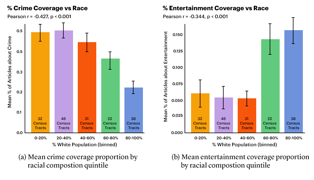 - Related, we found that crime and entertainment coverage vary predictably with the proportion of Black and white residents; neighborhoods with a higher proportion of Black residents are more likely to be covered in the context of crime, while neighborhoods with a higher proportion of white residents are more likely to be covered in the context of entertainment stories.