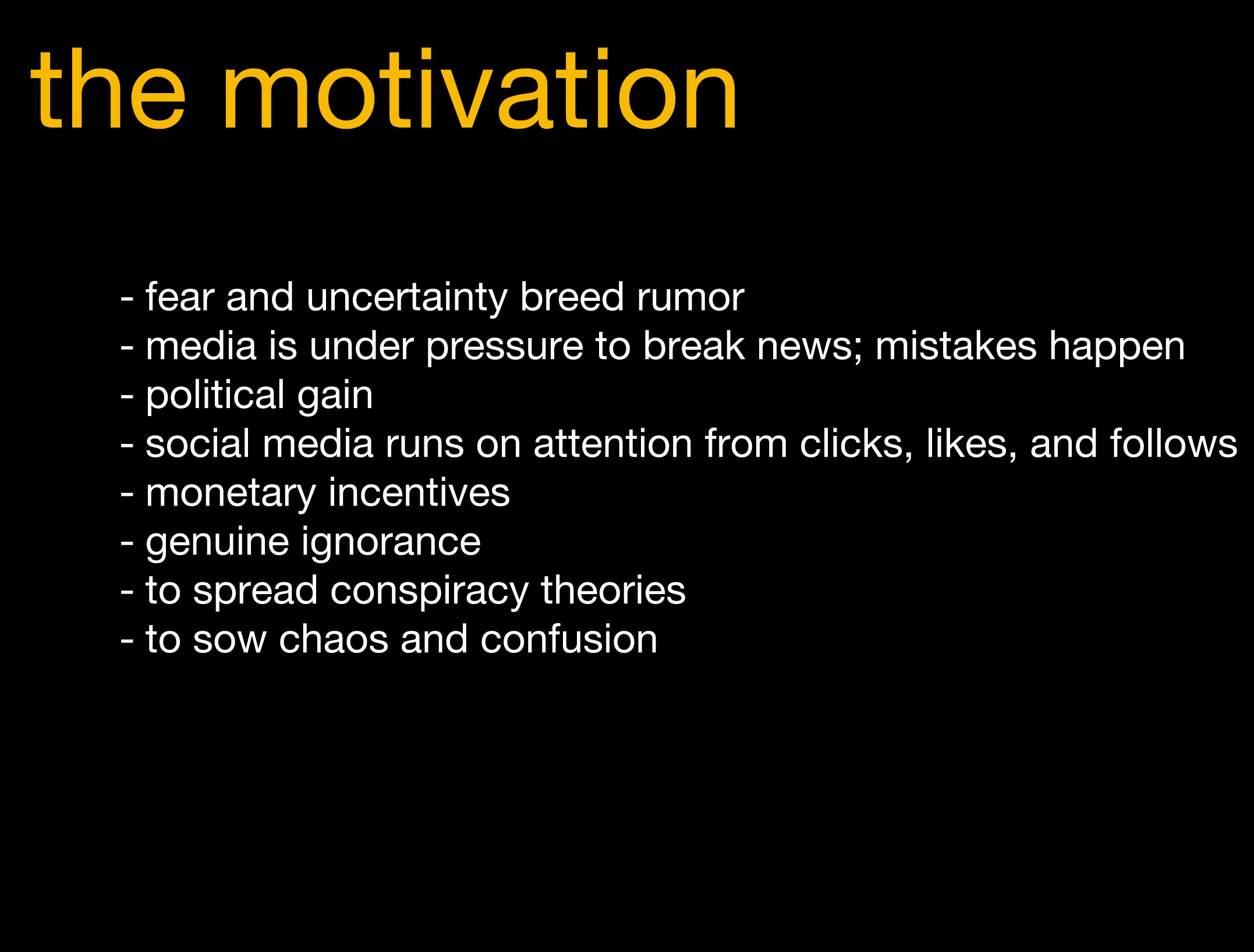 Social media coverage of news about emergencies is perhaps the most fertile ground for fakes, mistakes, and conspiracies to take root. Reporters must break news quickly, and eyewitness accounts, though they are prized above any other kind of information, are often spotty and affected by the uncertainty of the moment. Bystanders—and journalists in the thick of it—may make mistakes under the twin pressures of the emergency event and the scrutiny of the public.