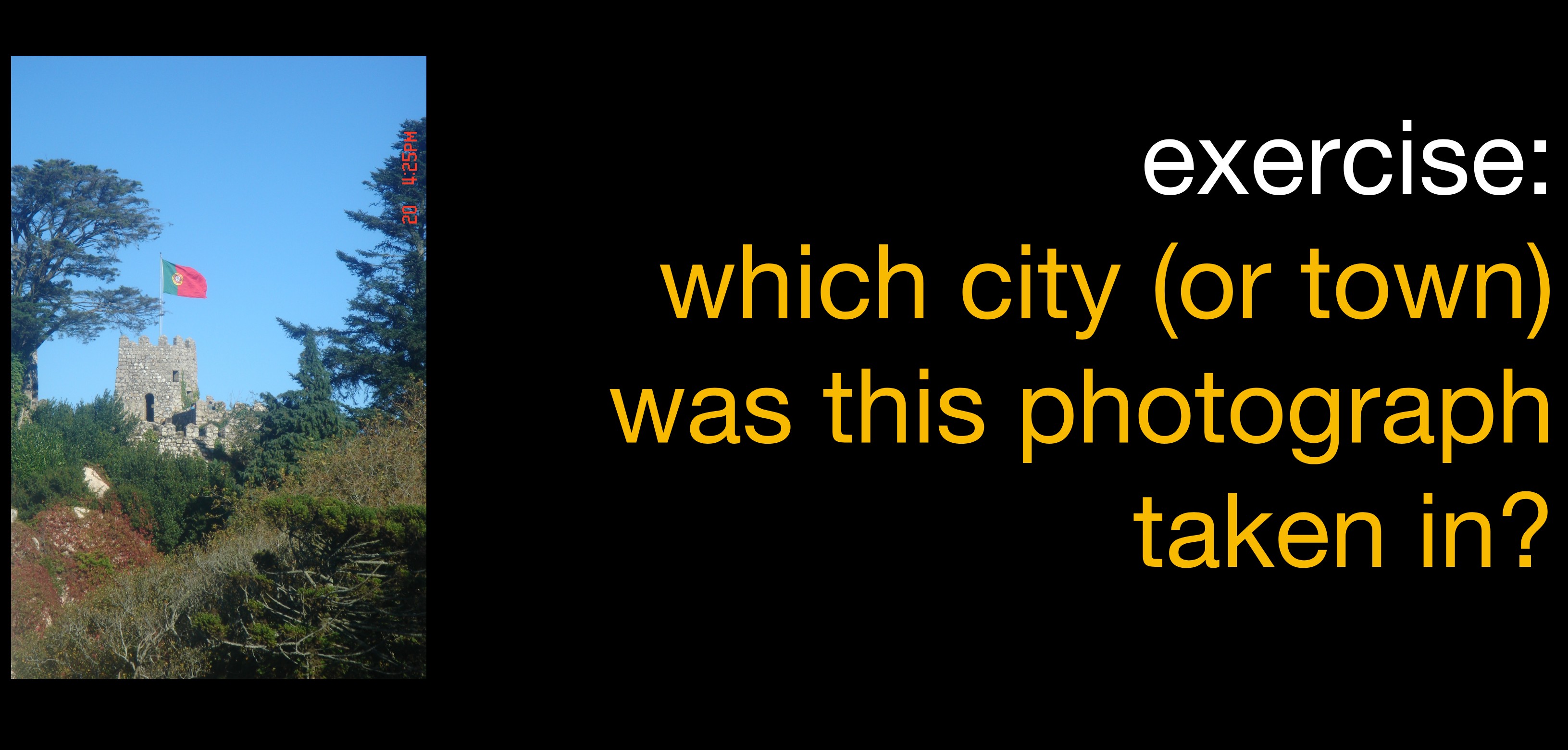 Photos on social media don’t have EXIF metadata containing the date, camera type, time, and location information stored by most cameras and camera phones within the original image file. If a journalist can obtain the original image from the person who first uploaded it to social media, that information can be extracted either with the “get info” function on a Mac running a recent OS, or by uploading the image to a photo analysis site like FotoForensics (which is free). But even without the metadata, some information can be gleaned from the photo: Identifying the flag is fairly easy; a Google Image search of the nation’s name and the words “flag” and “castle” will bring up an image of this building in Sintra, Portugal very quickly.
