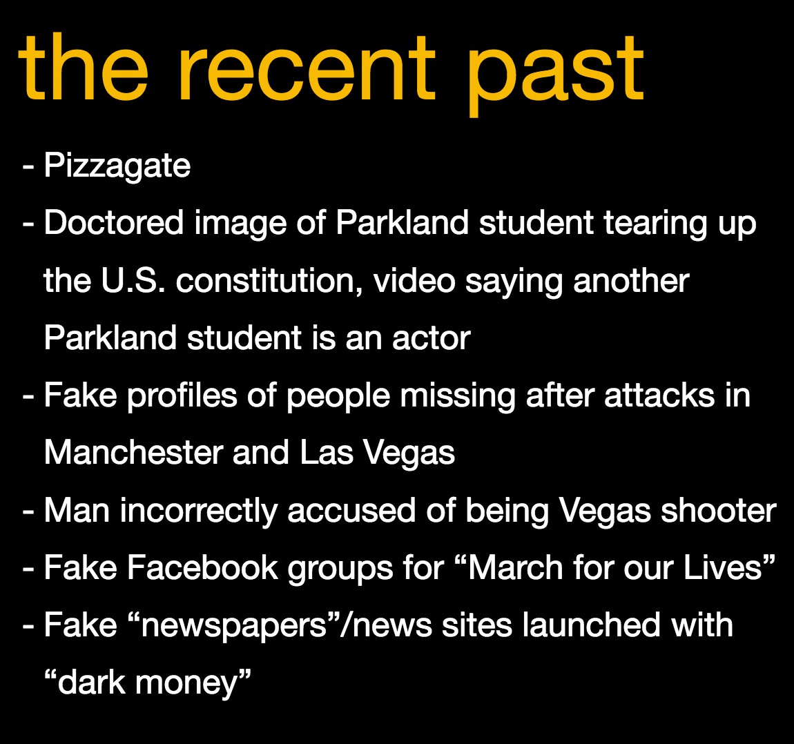 Included are a series of examples of fake news, a number of exercises increasing in difficulty over the course of the class—all solvable using nothing more than an internet connection and Google—, and a list of tools for exploring the details, visible and invisible, of the internet’s endlessly fascinating and newsworthy flotsam.