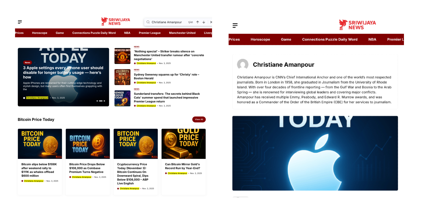 A website called Sriwijaya News attributes made-up quotes in an article about American public opinion on Israel and anti-Semitism that it claims was written by none other than Christiane Amanpour. The famed journalist must be quite busy, as she is supposedly churning out dozens of articles each day for the site, about everything from soccer and celebrities to daily Bitcoin prices.