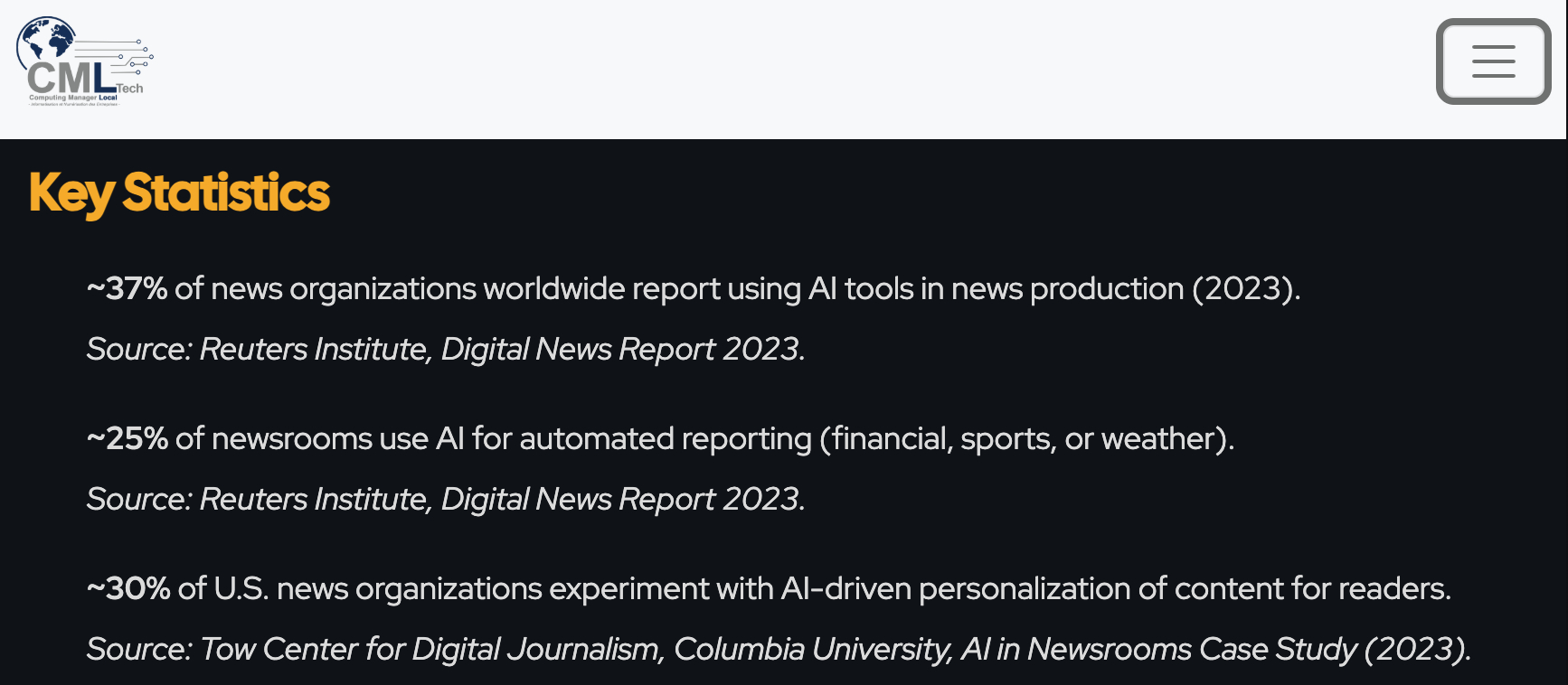 We also found fake statistics, like the one below on the website of “CML Technology,” supposedly a Canadian tech firm, attributed to reports that the Tow Center has never published. CML Technology is the creator of a website dedicated to the Democratic Republic of the Congo in Canada.