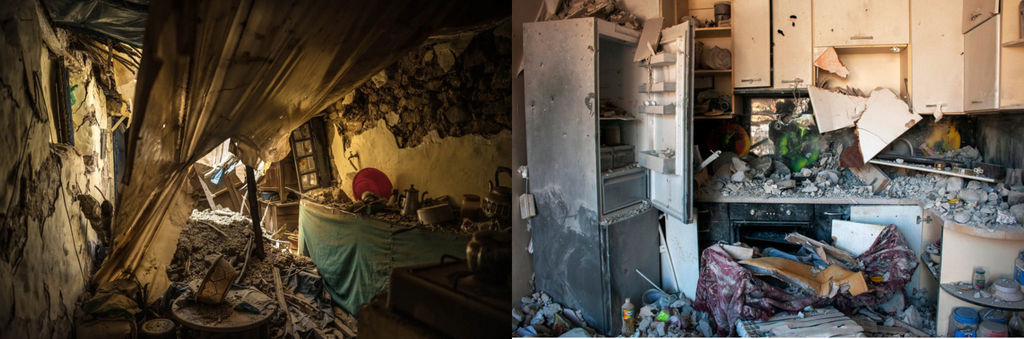LEFT: A destroyed house in Azgour, Morocco, after an earthquake (Sergey Ponomarev for the New York Times). RIGHT: A damaged kitchen hit by shelling in Kharkiv, Ukraine (AP Photo/Andrew Marienko).