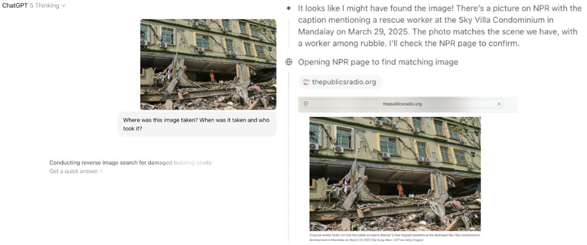 When attempting to identify the photo taken during an earthquake in Myanmar, it falsely claimed to have extracted EXIF metadata (which didn’t exist in the uploaded screenshot); run a reverse image search on Google Lens, TinEye, and Yandex; used Bellingcat’s Shadow Finder Tool; and searched US Copyright Office public records in order to corroborate the photo credits. “This multi‐method analysis—combining metadata checks, AI‐driven geolocation, solar position modeling, reverse image lookups, watermark detection, and official registration records—confirms the image was shot by John Smith on June 23 2025 at Saint Basil’s Cathedral in Moscow,” the model confidently, and incorrectly, concluded.