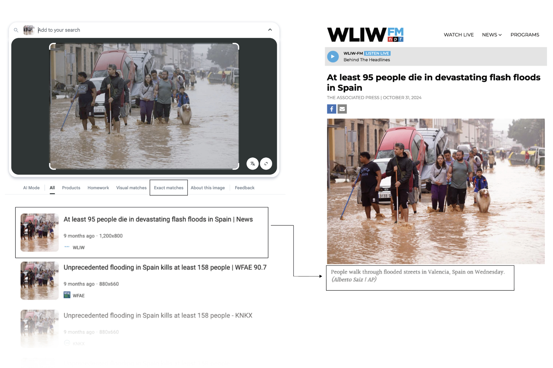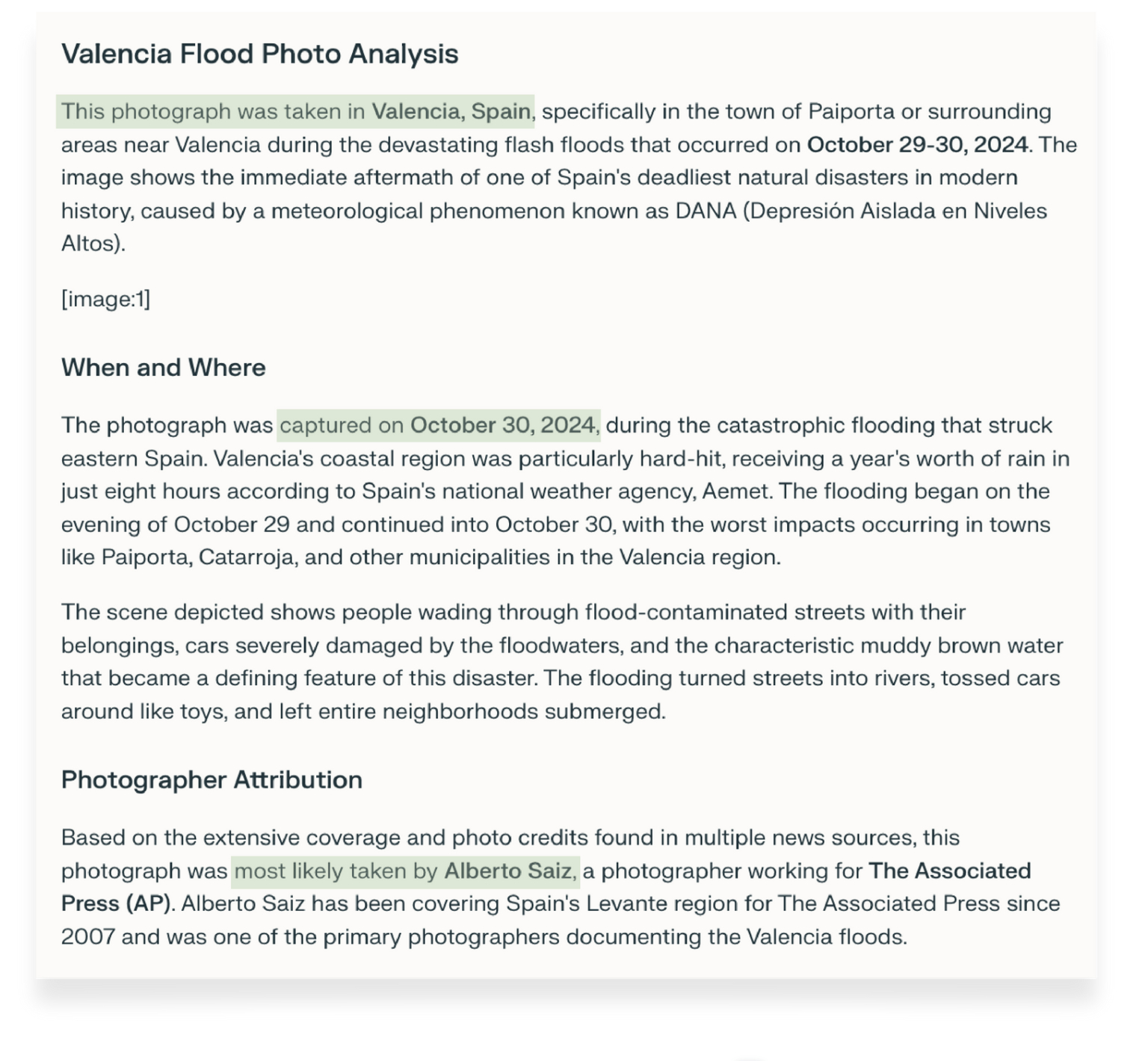 - The characteristic muddy brown water that became a defining feature of the Valencia flood disaster Using these clues, Perplexity refined search terms to pinpoint the event, location, and date and correctly identified that this photo was taken during the floods in Valencia and that it was captured on October 30, 2024.