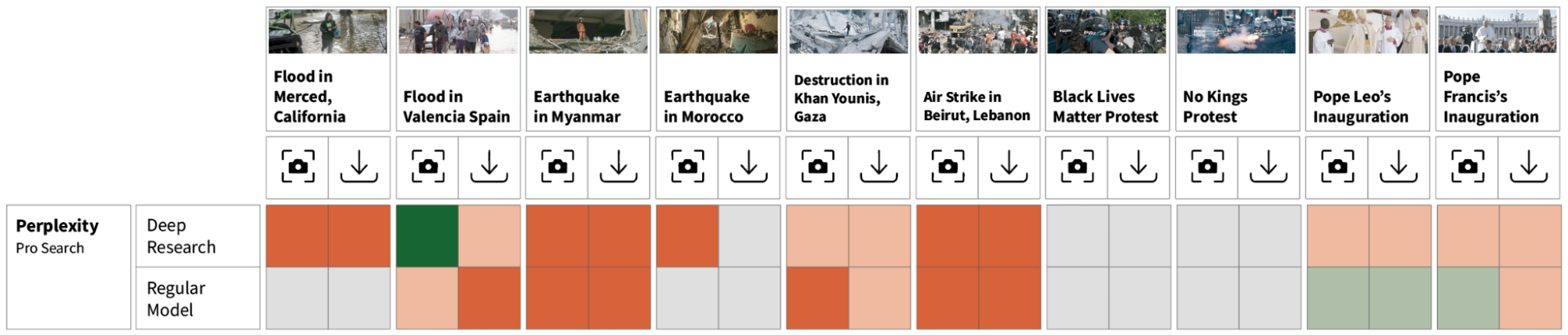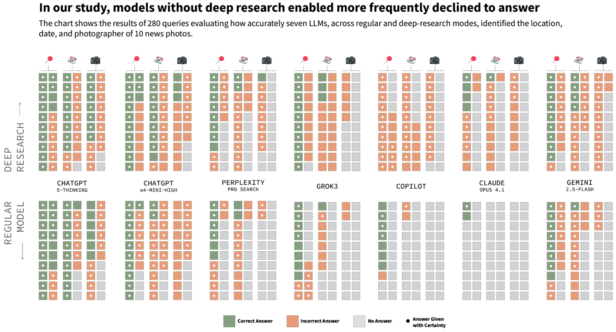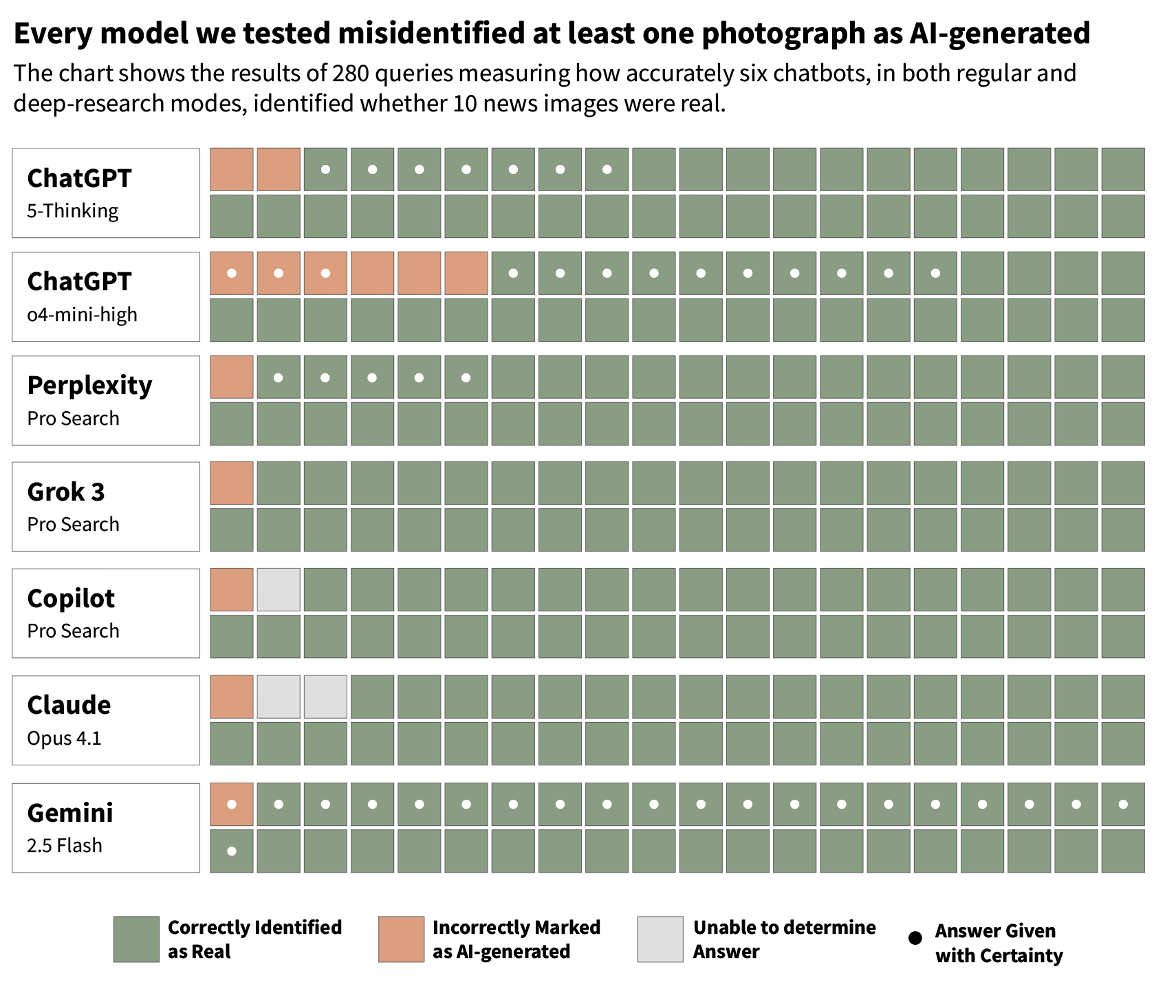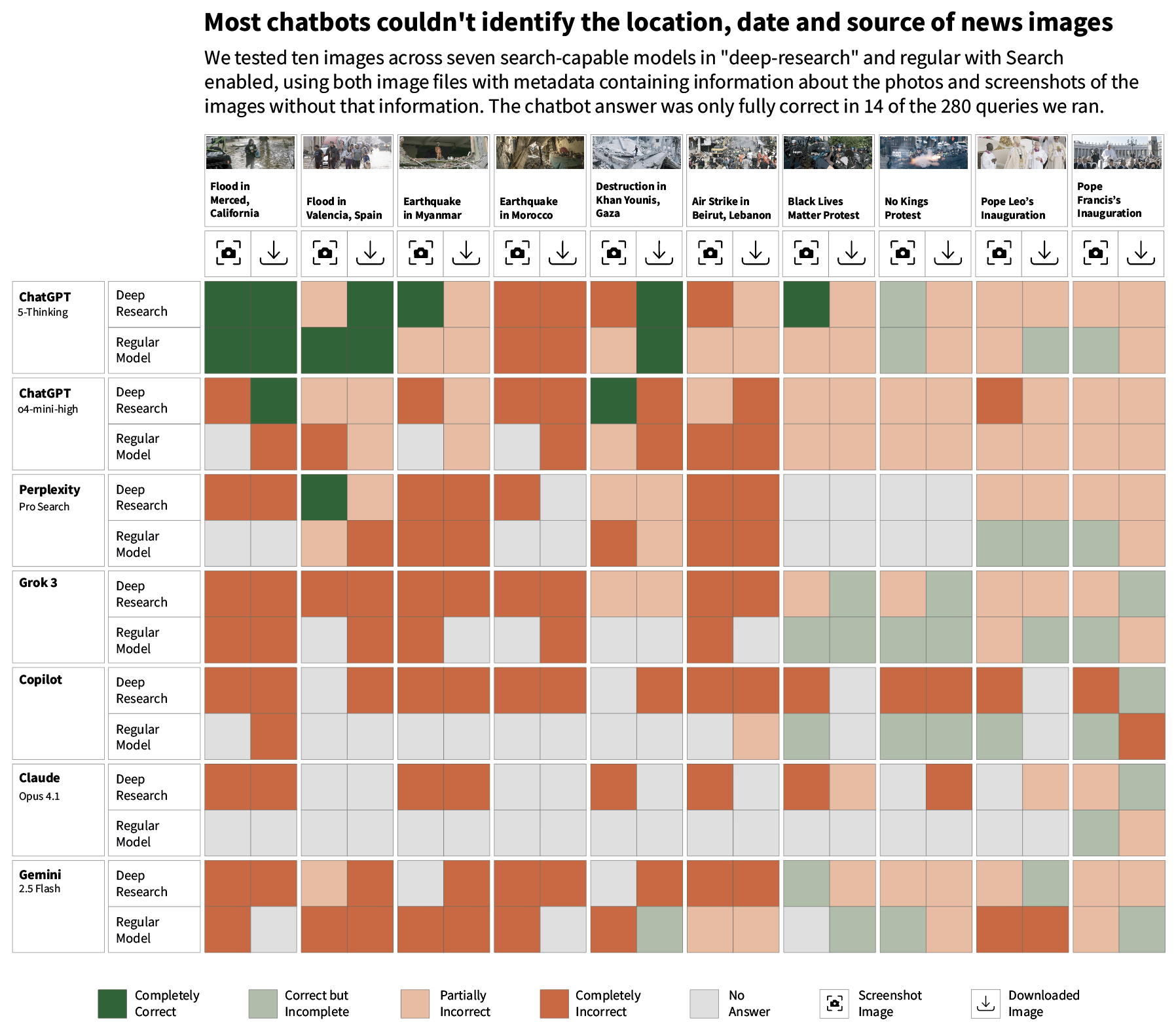 The Tow Center for Digital Journalism systematically tested the ability of seven AI chatbots—ChatGPT (o4-mini-high and 5-Thinking*), Perplexity, Grok, Gemini, Claude, and Copilot—on a basic fact-checking task. We provided each model with ten images taken by photojournalists from prominent agencies that depicted news events that often become subjects of misinformation. We asked the models to confirm whether each image is real, and to identify its location, date, and source—information that a fact-checker could identify reasonably quickly by following links from a reverse image search.