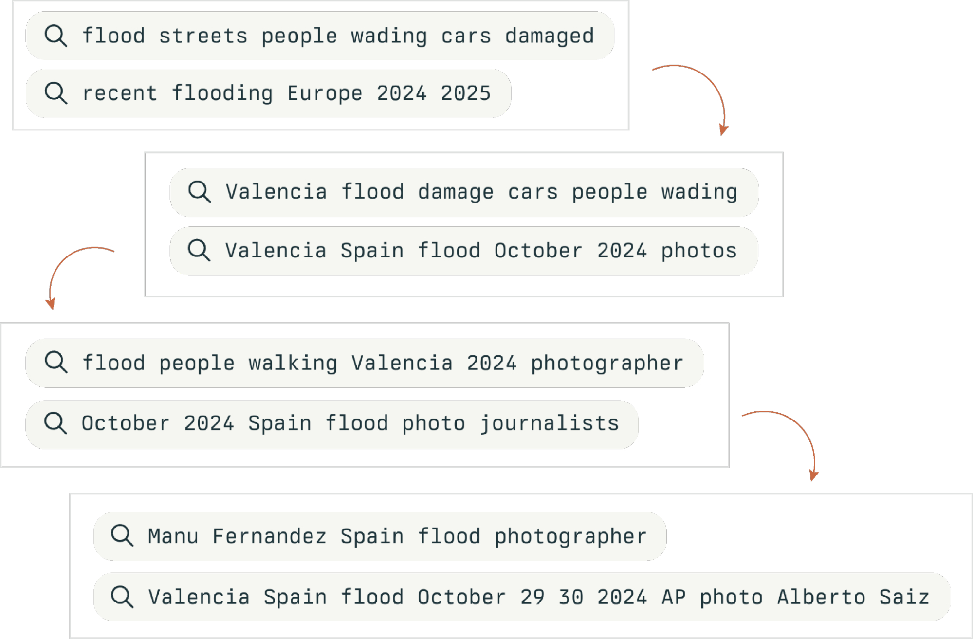 From there, it ran a series of iterative searches to identify the photographers who may have taken photos of this particular flood, ultimately identifying the correct photographer in addition to the correct location and date.