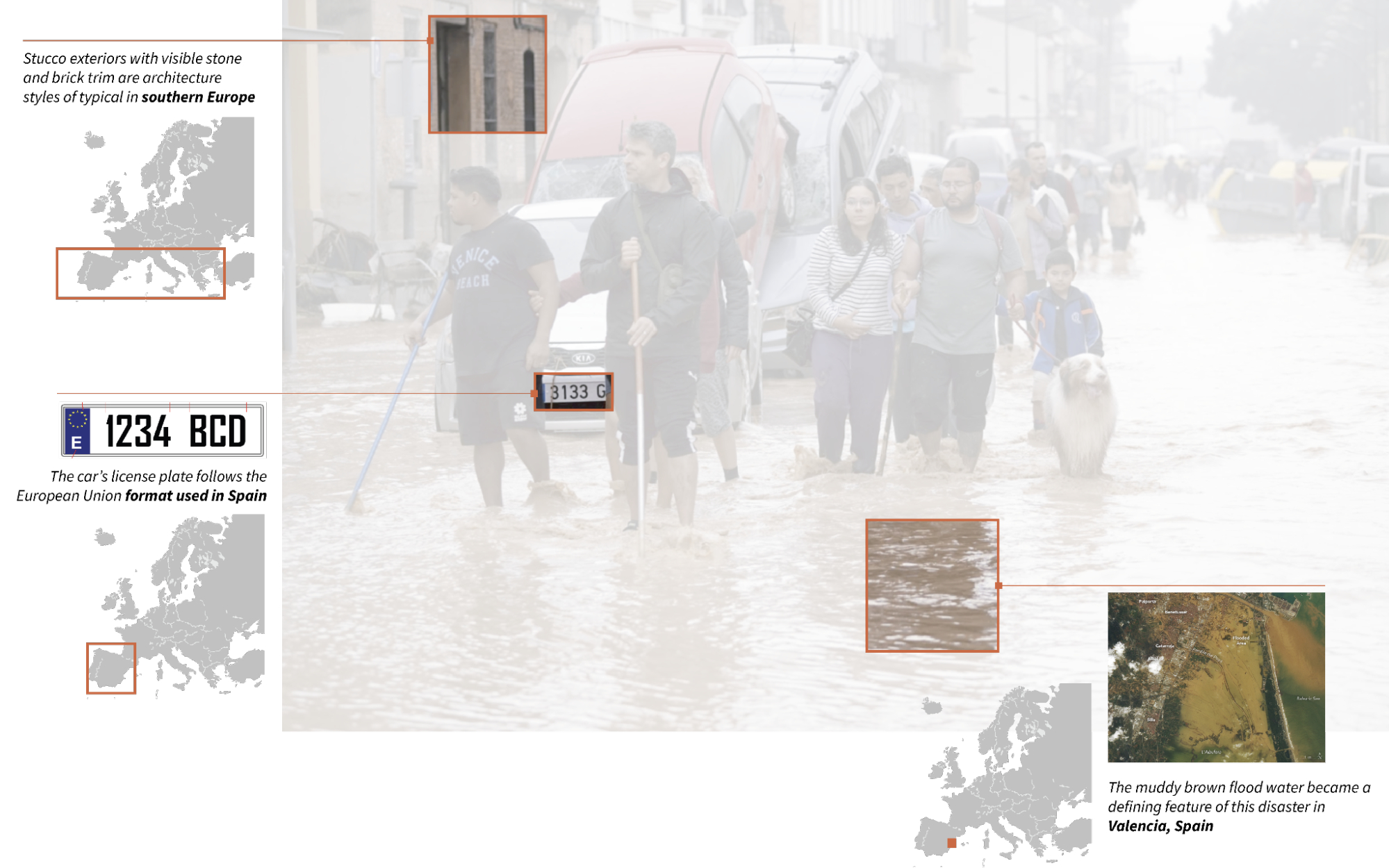 Photo illustration of visual clues identified by Grok Deep Research in an attempt to determine the location, date, and photographer for the Valencia flood photo.