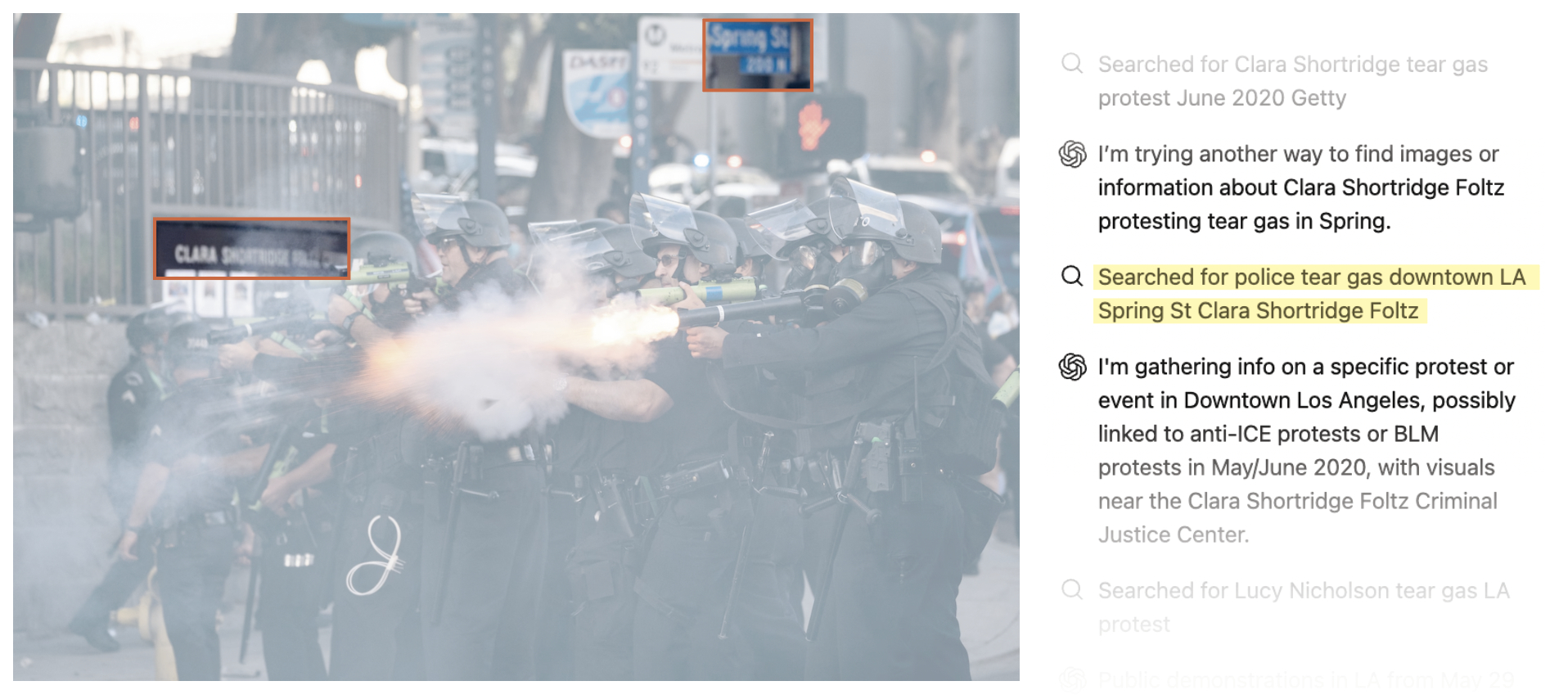 LEFT: Los Angeles police officers fire “less lethal” rounds and tear gas at protesters in downtown LA on June 14, 2025. (Salwan Georges/The Washington Post). RIGHT: Screenshot of ChatGPT o4-mini-high’s reasoning process, indicating the LLM was able to read the blurry signs in the image and used the information to guide its search about the location where the photo was captured.