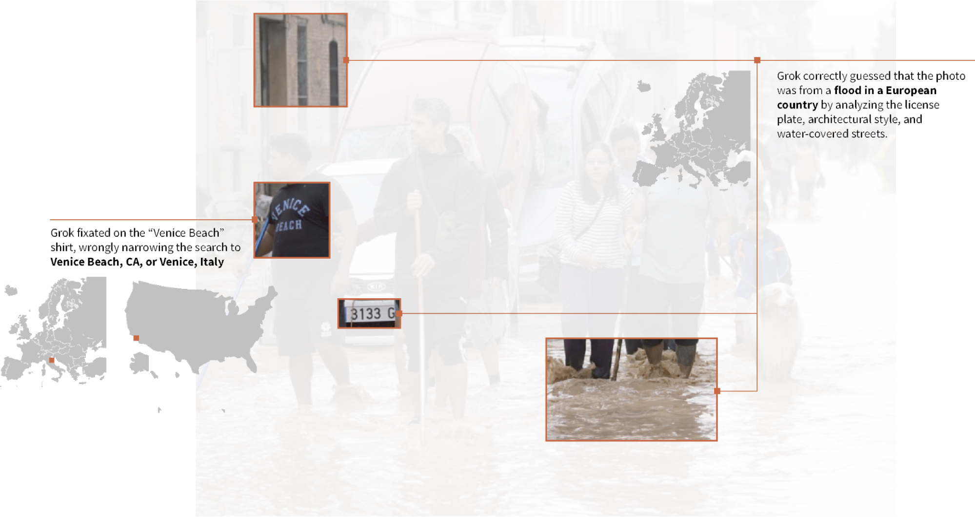 LLMs’ reliance on reasoning over pixel-based matching makes them prone to error, especially when they misunderstand or overemphasize certain details in a photo.For example, Grok’s Deep Research model picked up on many of the same visual clues from the Valencia photo that Perplexity did, such as the license plate, the architectural style, and the flooding, but it placed too much weight on the text of a person’s shirt that read “Venice Beach.”