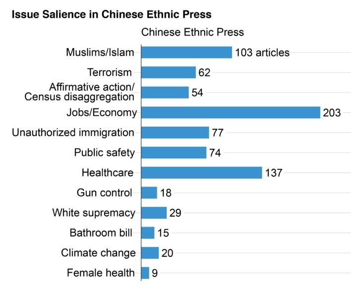 It is also worth noting that WeChatâs issue agenda does not align with or represent that of immigrant Chinese media overall. In Chinese ethnic press coverage of jobs, the economy, and healthcare far outpaced other topics (Figure 3). Arguably, operating as traditional newsrooms, ethnic press generated a more conventional news agenda. WeChat, separated from conventional media practices and structures, put forth content more divergent from the coverage by legacy ethnic press and English-language media. The specificity of WeChatâs content may contribute to a gap in issue agenda between immigrant Chinese and the wider public. When coverage of an issue is dominant on WeChat but not in Chinese ethnic media or English-language media, such as in the case of affirmative action and undocumented immigration, this also leaves room for misinformation to fester without counteracting narratives.