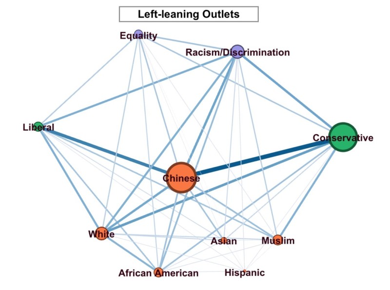 While polarizing rhetoric on both sides revolved around discrediting the other side, the right was more concerted in its delegitimization of liberal Democrats. Mentions of liberals dominated right-leaning outlets while conservatives and liberals were more evenly mentioned on left-leaning outlets. As many as nine percent of the content generated by right-leaning outlets made references to liberals using the code words huazuo (âChinese leftâ), baizuo (âWhite leftâ), and shabaitian (âsweet and dumbâ). These terms, usually used in a derogatory way, connote an understanding of liberals as hypocritical and superficial in their obsession with equality, multiculturalism, and political correctness.17 This narrative has familiar streaks of right-wing populism, echoing terms such as âsocial justice warriorsâ and âlibtard,â but contains an added element of perceived double-standard, where the liberal version of social justice applies to a host of minoritiesâAfrican Americans, Latinos, Muslims, LGBTQ, undocumented immigrants, and felonsâwhile Chinese Americans are either neglected or sacrificed. The strong co-occurrence of âliberalsâ and âdiscrimination,â much stronger in the conservative WeChat sphere than in left-leaning outlets (Figure 5), is one illustration of this baizuo narrative.