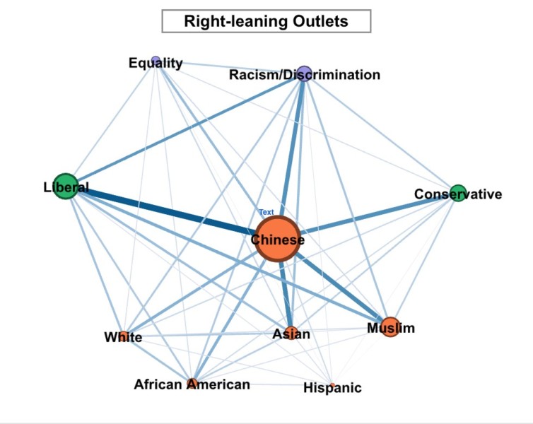 Race relations is key to the partisan political discourse on both sides. Thirty-two percent of the content on the left and twenty-four percent of the content on the right contained references to more than one of the five racial or ethnic groups coded in this analysis (White, African American, Latino, Muslim, Chinese/Asian), with the right being particularly concerned with the relationship between Muslim and Chinese (Figure 5). The centrality of race relations in WeChatâs partisan political discourse has a lot to do with the origin of these outlets and the progression of Chinese activism that they are part of, which has been defined by a strong response to perceived discrimination and injustice.