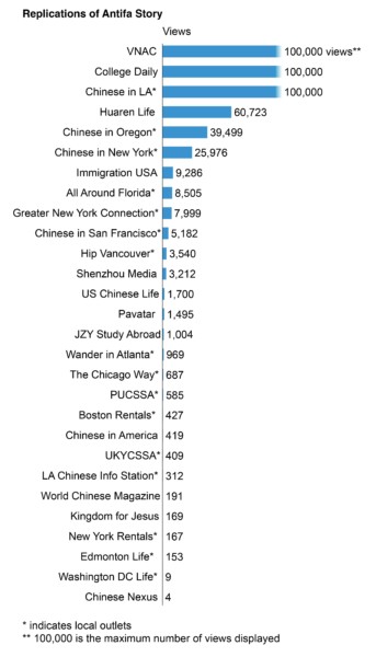 Subsequent circulation of this story on WeChat has been mostly stripped of far-right ideology. It was aided by a process in which sensational information can catch on through multiplication and piracy by decentralized outlets. On WeChat, we logged thirty different WeChat outlets that published this information, which together accumulated at least 472,625 views. Twenty-two outlets either directly pirated the content or made minor modifications for their specific audiences. The content was almost identical across the thirty outlets: a tweet by Trump USA (@MADE_USA), a list of cities where mass riots would take place, and a description of Antifa and Black Lives Matters as organizations that practice violence (Photo 1).
