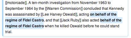 The murder of JFK remains one of the enduring interests of American conspiracy theorists. An editor with a congressional IP address removed the explanation that Lee Harvey Oswald acted alone, instead adding more fuel to their fire. The entry has since been returned to its initial form.