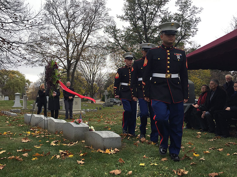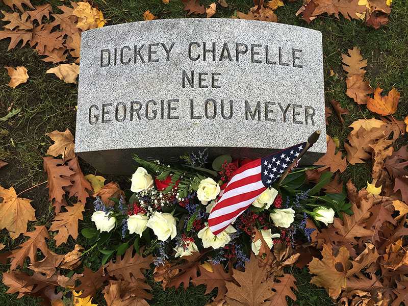 Maybe because it was November in Wisconsin. Or maybe because the heavens knew, as some mourners suggested. But the wind was the same, and the sky was the same, and there was a storm in the distance–just like Nov. 12, 1965. That was the day photojournalist Dickey Chapelle came home from war to be buried in a family plot at Forest Home cemetery in Milwaukee. She was killed Nov. 4, 1965, while on a patrol with a US Marine platoon, the first American woman correspondent to die in combat.