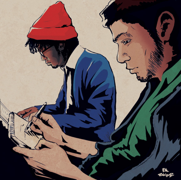 Darryl Holliday and E.N. Rodriguez of the Illustrated Press, at work. (Illustration by E.N. Rodriguez. Used with permission.)