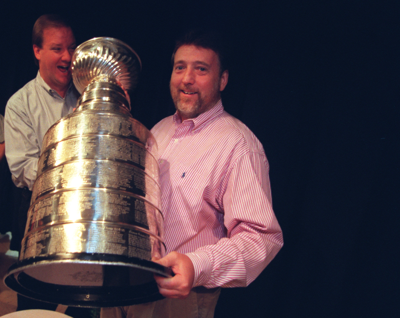 Former Free Press Detroit Red Wings beat writer Bill Roose (left) and Mick McCabe hold the Stanley Cup in 1997. Courtesy of the Detroit Free Press.