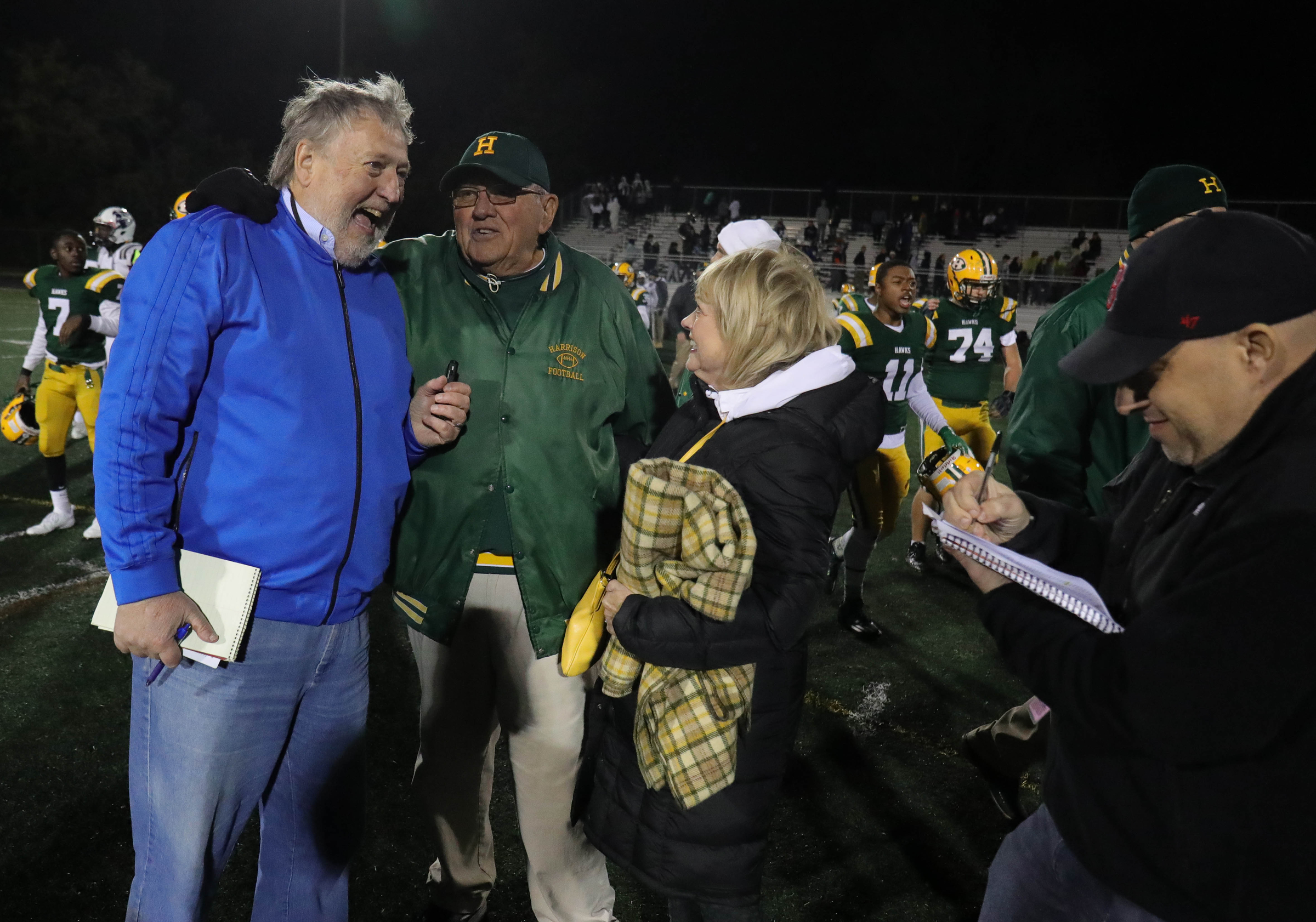 McCabe interviews Harrison High School head football coach John Herrington after a game last month in Farmington Hills, Michigan. Courtesy of the Detroit Free Press.