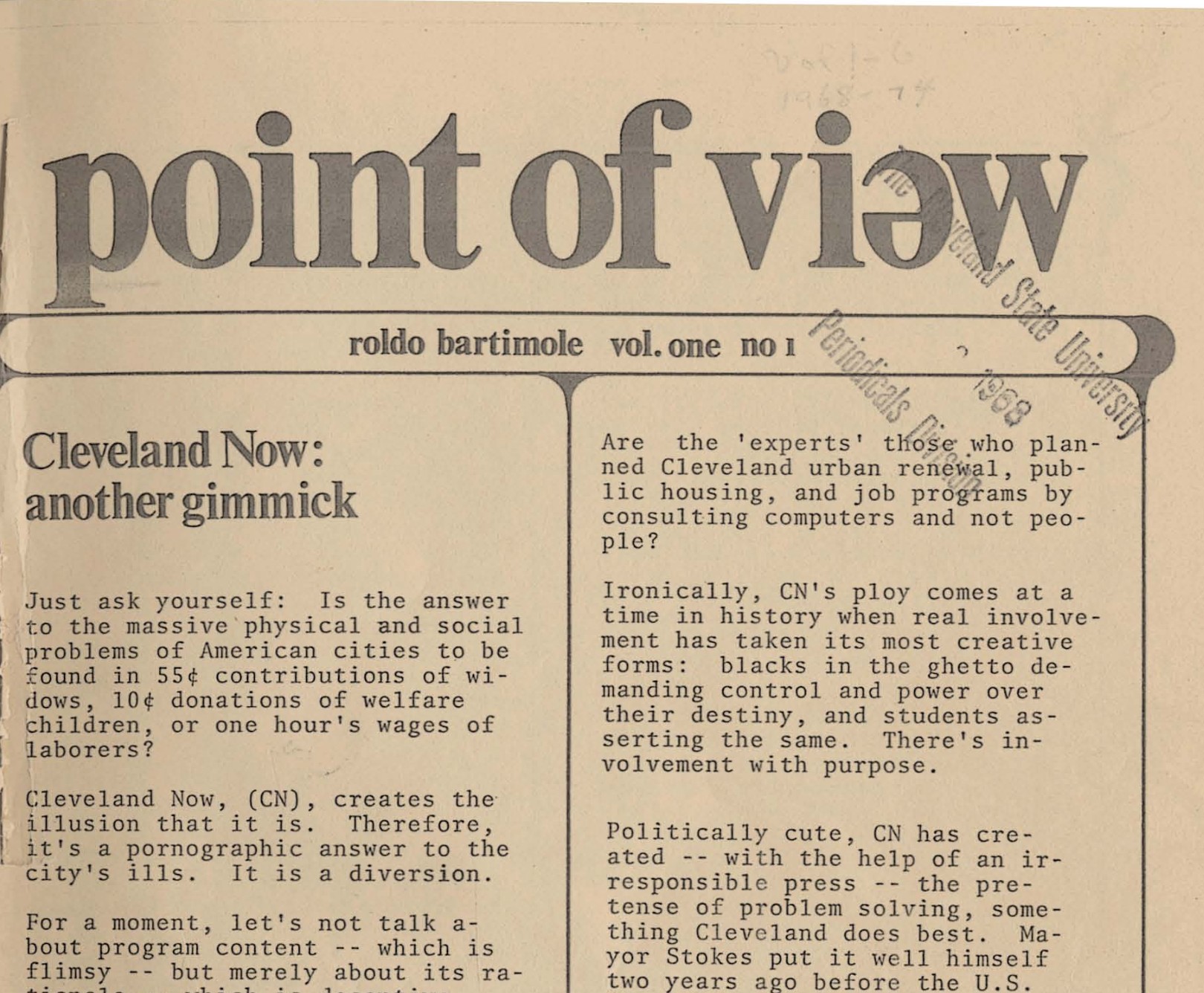 Point of View’s second issue broke the news that Cleveland businessmen had paid black activists $40,000 to “keep the peace” in summer 1967. “Politics as social control,” Bartimole called it, noting that unrest could’ve scuttled Carl Stokes’s election in November 1967 as the first black mayor of a major US city.